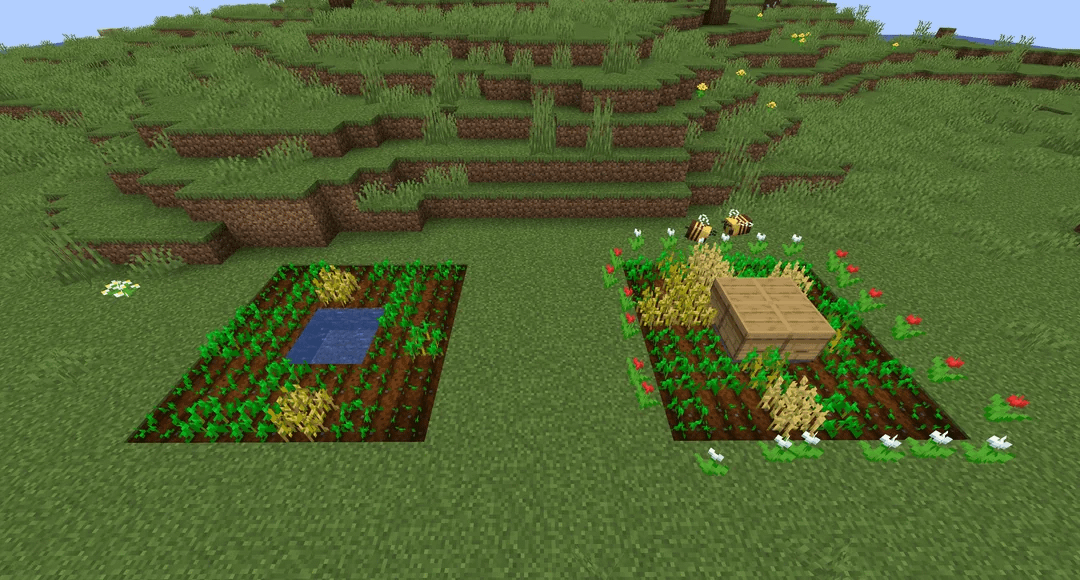 これは村人自動農場にも非常に役立ちます。これらの農場の問題の 1 つは、プレイヤーが作物から 128 ブロック以上離れていると作物が育たないことです。これは、村人には収集するものが何もなく、仕事ができないことを意味します。しかし、ミツバチは依然として受粉し、作物を成長させます。つまり、農場はそれほど効率的ではないものの、長距離移動中も作業を続けることができるということです。