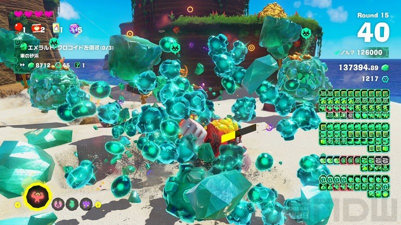 「エメラルドラッシュ」は有料追加コンテンツ『DKアイランド&エメラルドラッシュ』で遊べるモード。エメラルド塊を壊したりヴォイドミッションを達成したりして、エメラルドをたくさん集めるのが目的です。