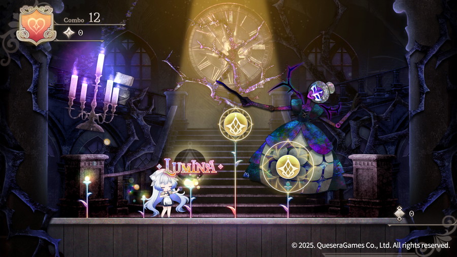 本作は、ステージを駆け抜けながら、宝石の姿で並ぶ音符をタイミングよく叩いて音楽を奏でるランアクション型のリズムゲーム。記憶を失った少女二人が、舞台公演を完成させることで劇場に再び命を取り戻し、秘密が明かされていく物語である。プレイヤーは舞台監督のアレフと女優のリオラを導き、2つのキーだけで遊べるシンプルな操作で、音楽とともにステージを駆け抜けていく。歪められた童話や伝説を題材にしたミュージカルを上演し、物語を即興で変えて修復することで、美しくも不気味で悲しい舞台をハッピーエンドに導くことが目標となる。また、クライマックスには歌の対決となるボス戦も待っている。