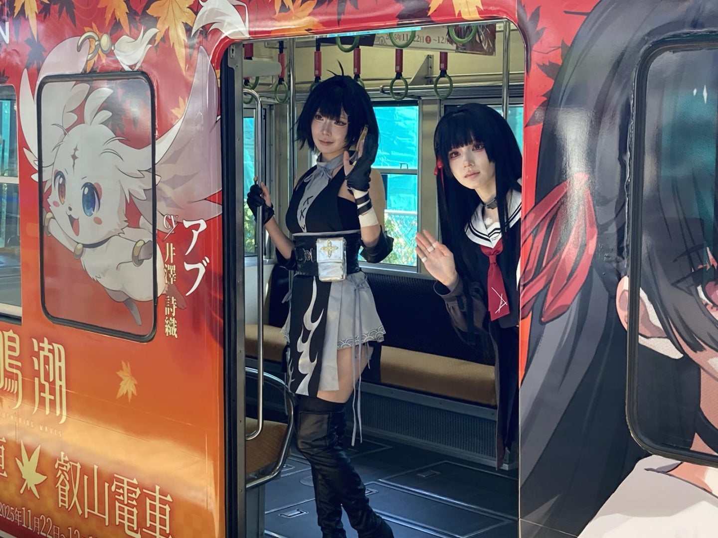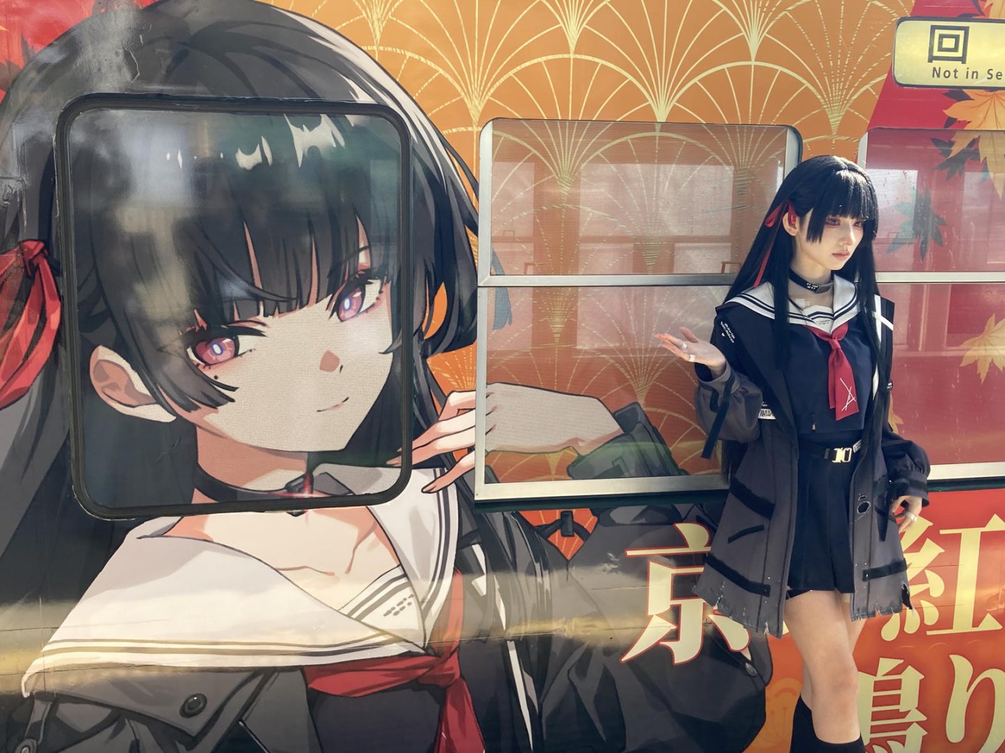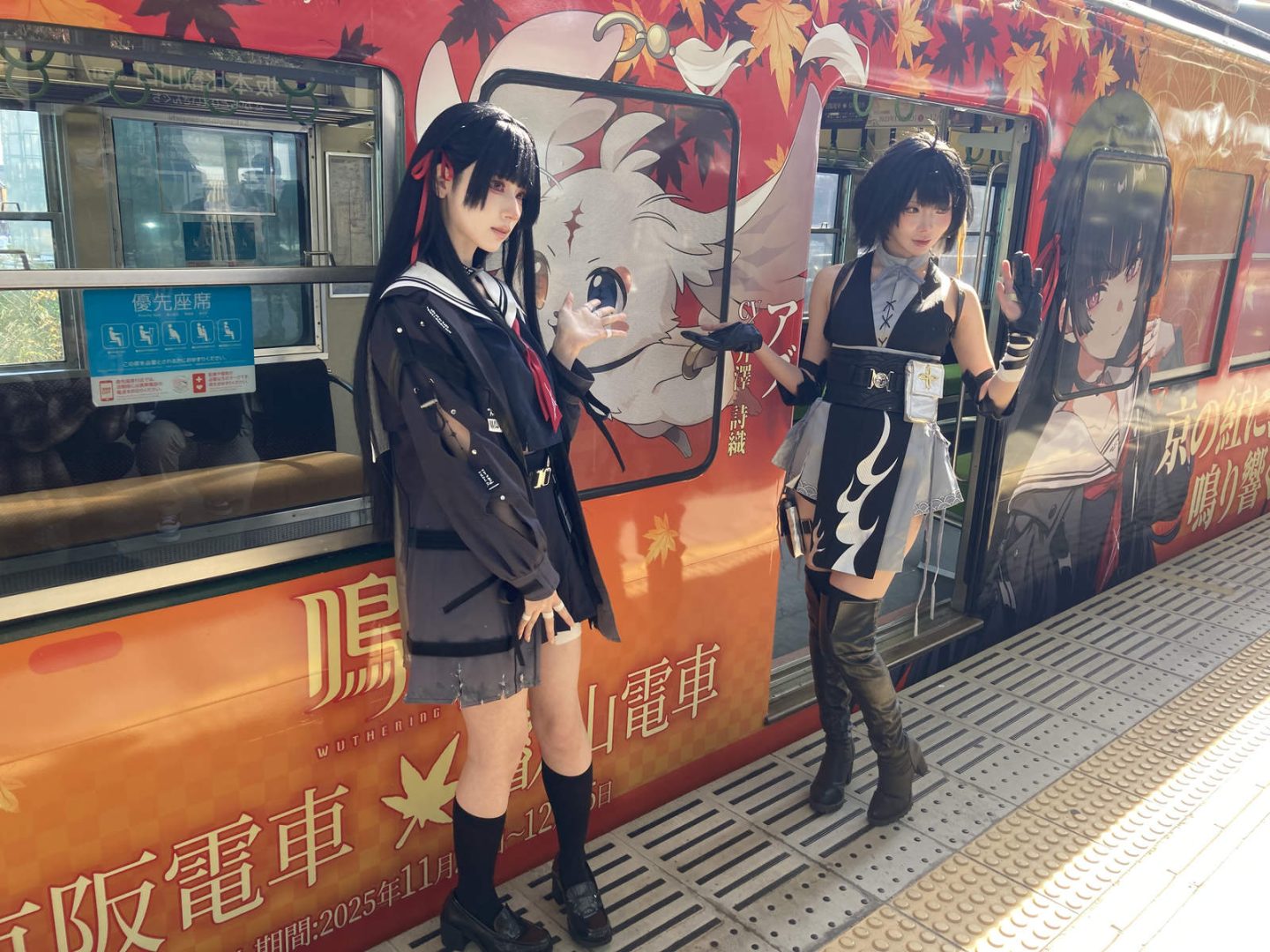 今回のコラボでは、千咲がフィーチャーされている。彼女ほど秋の京都に似合うキャラクターもそうはいないだろう。千咲の衣装は日本の伝統的な学生服を彷彿とさせるほか、赤い瞳は深まる秋で紅葉する京都と不思議なほど調和している。実際に坂本比叡山口駅を訪れると木々はすっかり紅葉しており、『鳴潮』のVer2.8で新たな仲間となった千咲を祝福する舞台として、秋の京都は本当にふさわしい場所だと感じられた。駅のホームも千咲を迎える準備が整い、コラボ列車の到着を待つ。