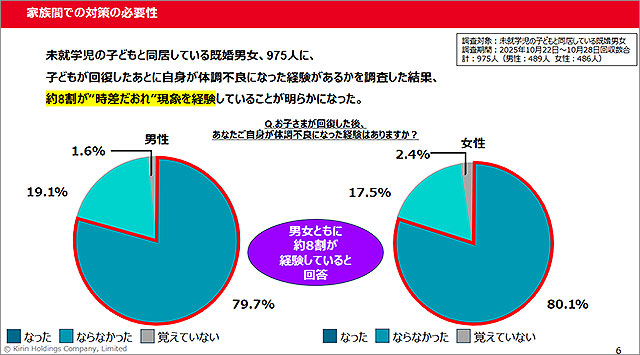 また、未就学児の子どもと同居している既婚男女に、子どもが回復したあとに自身が体調不良になった経験があるかを調査した結果、約8割が経験していることが明らかになりました」(キリン 桜井可奈子さん)