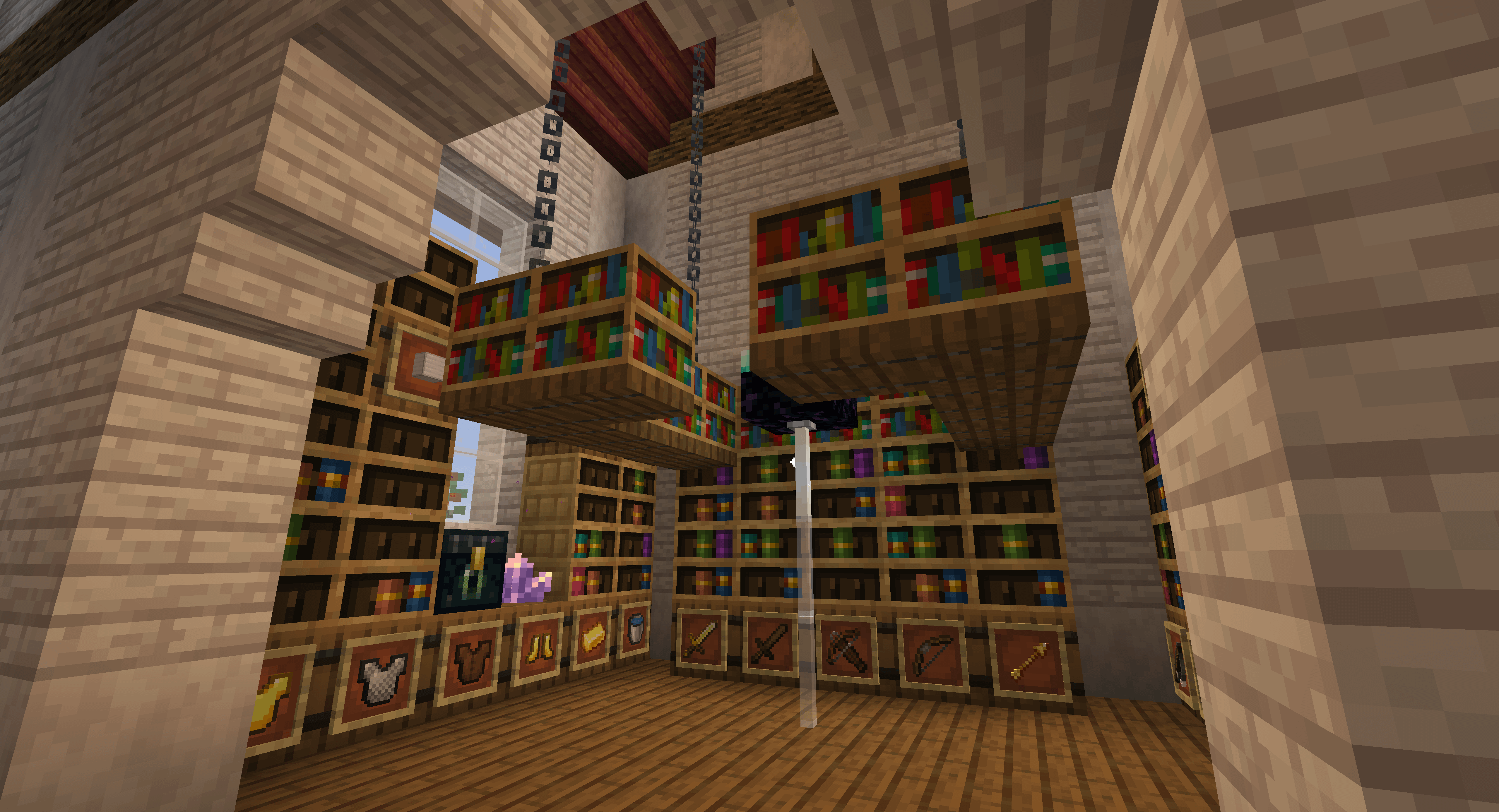 これが私の解決策です。典型的なレイアウトを魅惑的な部屋に吊るし、利用可能なスペースを魅惑的な本、金床、砥石などの保管場所に使用できます。ジャンプする必要はなく、すべてに簡単にアクセスできます。お役に立てば幸いです!