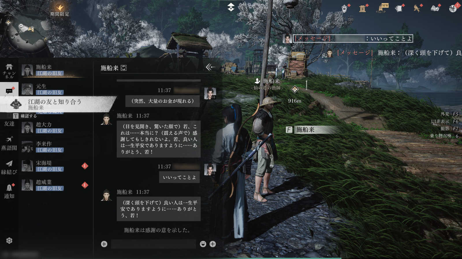 そんな本作では、一部のNPCと生成AIによるチャットが可能。チャットの中で相手の悩みを解決したり、相手を納得させたりできれば親交が深まり「江湖の旧友」として毎週ランダムでプレゼントをくれるようになる。江湖の旧友が多いほど、報酬も多くなるシステムだ。