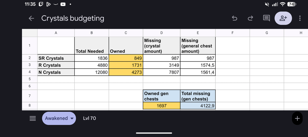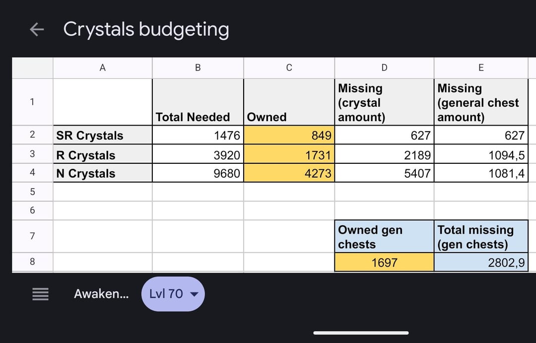 サイラスの 3 番目の神話を目覚めさせるために、まだどれだけのクリスタルを栽培する必要があるのかをより正確に把握するために、スプレッドシート (関数などすべてを含む爆笑) を作成したところですが、うーん、それには及ばないことがわかりました。 😂