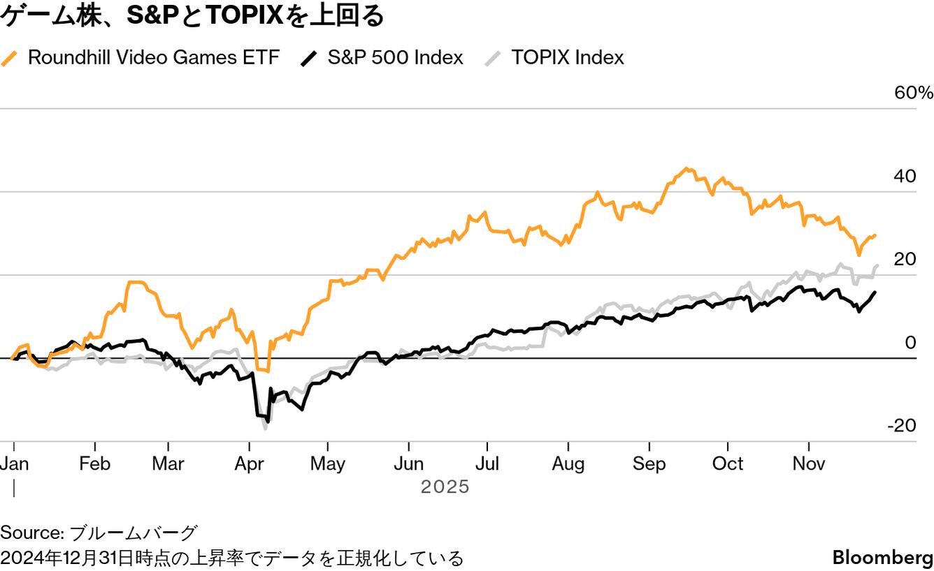 代表的なゲーム株に投資する上場投資信託のラウンドヒル・ビデオゲームETFは11月中旬までに米S&P500種株価指数と比べ2倍以上上昇。人工知能(AI)ブームをけん引する半導体のエヌビディアやグーグルを傘下に置くアルファベットなど、米国の主要テクノロジー株で構成される「マグニフィセントセブン」もアウトパフォームしている。