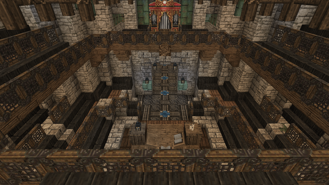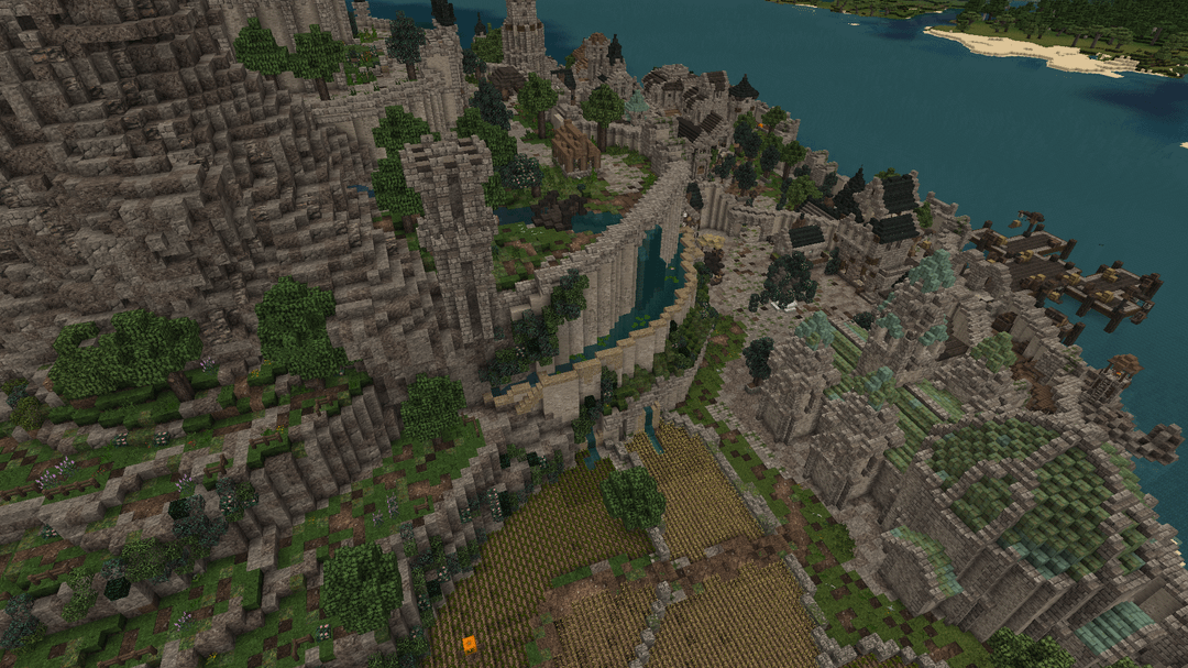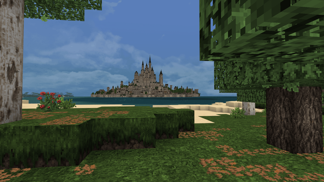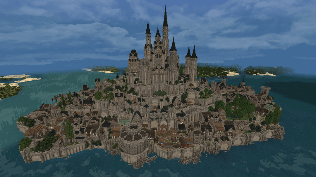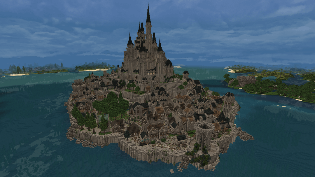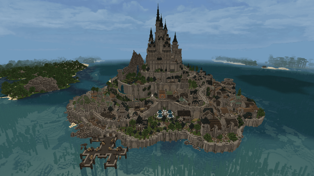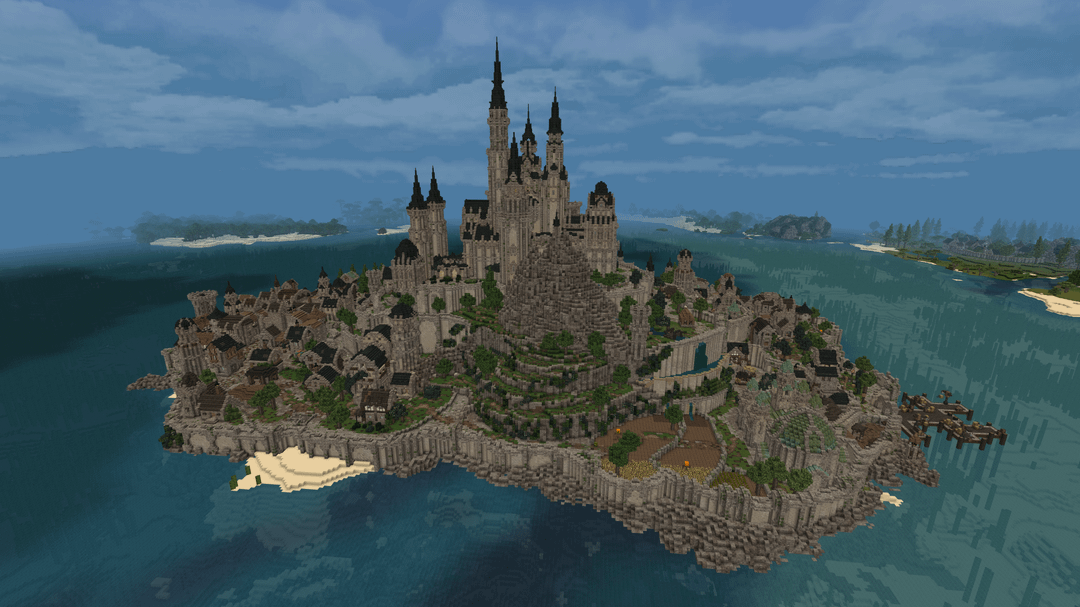 この単独ビルドはモン サン ミッシェルから大きなインスピレーションを受けています。城はどちらかというとファンタジー風ですが。都市の下層には村があり、すべての家には家具が完備されています。マーケット、ショップ、クラフトステーション、銭湯なども一緒に。
