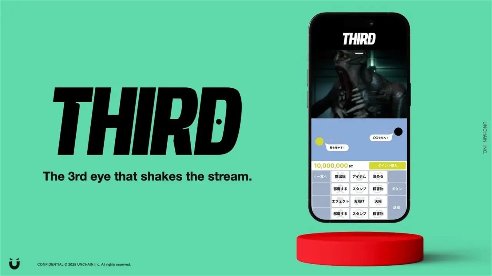 「THIRD」を開発するのは、ゲームのデザイン・ルールをゲーム以外の分野に応用する「ゲーミフィケーション」を用いて、エンターテイメントのサービス開発・運営およびマーケティング事業を手がける株式会社UNCHAIN。「THIRD」は、そんな同社の培ってきたゲーミフィケーションのノウハウを生かし、配信者と視聴者が一体となる没入型体験の実現を目指して開発されている。