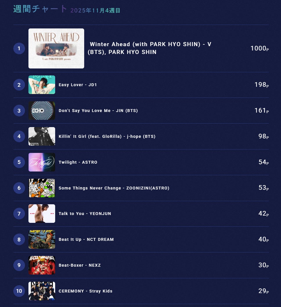 また、同日のチャート投票では、V(BTS)とPARK HYO SHINによる「Winter Ahead (with PARK HYO SHIN)」が1位を獲得し、番組内でも紹介されました。