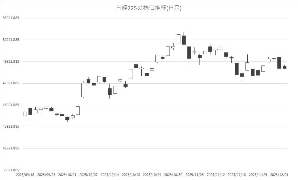 12月2日の東京株式市場はほぼ横ばいだった。日経平均株価は、前営業日比円17銭高の4万9303円45銭でこの日の取引を終えた。前日急落したこともあり、朝方から自律反発狙いの買いが入り、一時333円51銭高の4万9636円79銭まで買われる場面があったものの、買いが続かず後場に入ってマイナスに転じる場面もあった。月初の受給悪化を指摘する声もあったという。