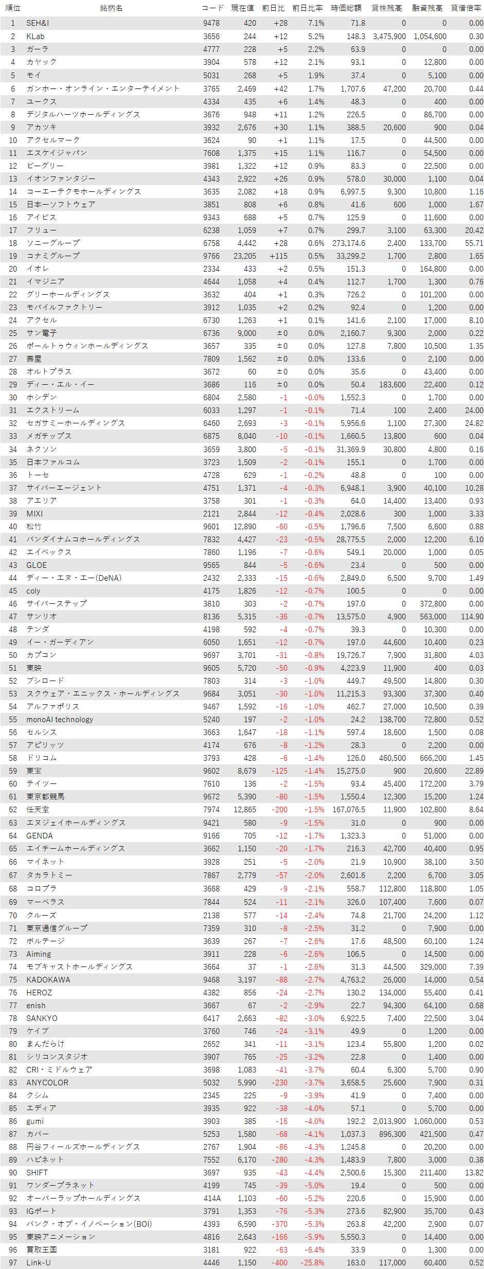 モバイルゲーム系の銘柄は、グリーHD<3632>、ガンホー<3765>、アカツキ<3932>、モバイルファクトリー<3912>が高く、サイバーエージェント<4751>、MIXI<2121>、DeNA<2432>、コロプラ<3668>、ケイブ<3760>が安い。