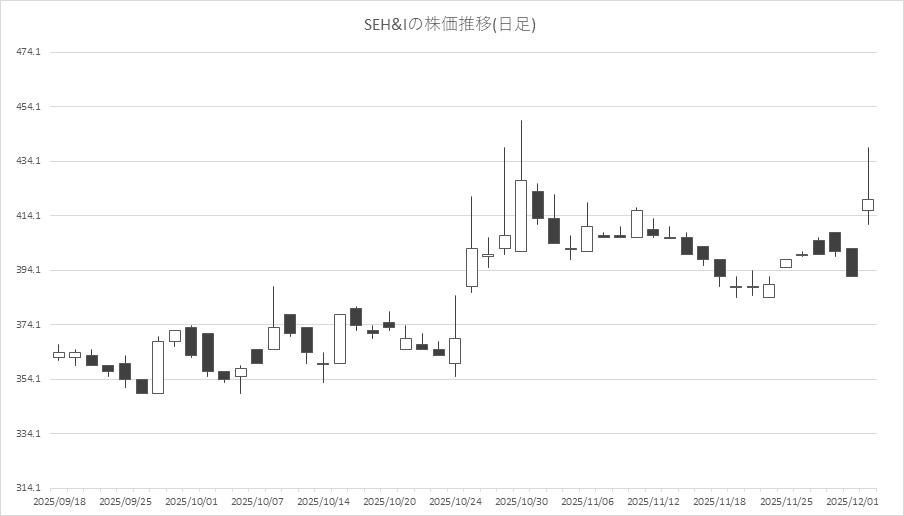 SEホールディングス・アンド・インキュベーションズ(SEH&I)<9478>が大幅反発。前日12月1日に発行済株式総数の1.91%に当たる30万株、1億円を上限とした自社株買いを実施すると発表したことが材料視された。