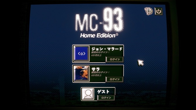 プレイヤーは4:3の縦横比が懐かしいレトロなモニターを前に、何とも懐かしい雰囲気を醸し出すログイン画面を見つめています。ジョンとサラという二人のアカウントにログインするにはパスワードが必要なため、しょうがなくゲストとしてのログインを続行します。