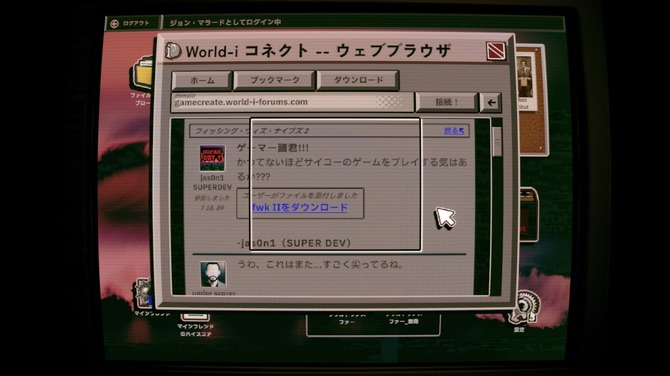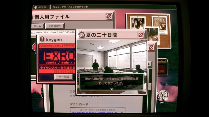 このリンクを踏むとゲーム内PCにデータがダウンロードされ、「zipファイルの解凍」「exeファイルの実行」という現実と同じ手順で、かつてアップロードされたゲームを実際に遊ぶことができます。