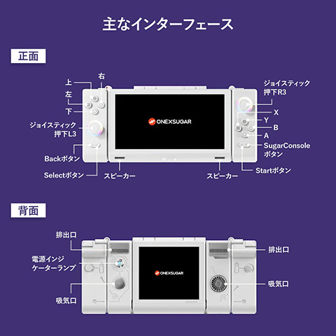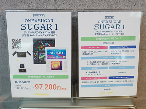 ONEXSUGAR SUGAR1は、メイン(6.01インチ、1,080×2,160)とセカンド(3.92インチ、1,080×1,240)の2つのOLEDディスプレイ、Snapdragon G3 Gen 3、Android 14を搭載した携帯型ゲーム機。メモリ容量は16GB。ストレージ容量は512GB。