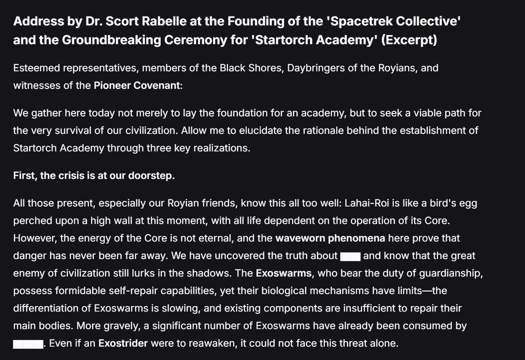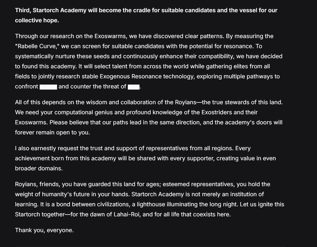 ロイアンの皆さん、友人の皆さん、あなたたちは長年にわたってこの土地を守ってきました。尊敬される代表の皆さん、あなたは人類の未来の重みをその手に握っています。スタートーチ アカデミーは単なる学習機関ではありません。それは文明間の絆であり、長い夜を照らす灯台です。ラハイ・ロイの夜明けと、ここに共存するすべての生命のために、一緒にこのスターターチに点火しましょう。