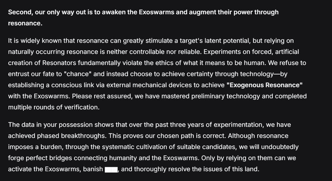 あなたが所有するデータは、過去 3 年間の実験を通じて、私たちが段階的なブレークスルーを達成したことを示しています。これは、選択したパスが正しいことを証明します。共鳴は負担ではありますが、適切な候補者を体系的に育成することで、間違いなく人類とエクソウォームをつなぐ完璧な橋を架けるでしょう。彼らに頼ってこそ、エグゾワームを発動させ、▇▇を追放し、この地の問題を徹底的に解決することができるのです。