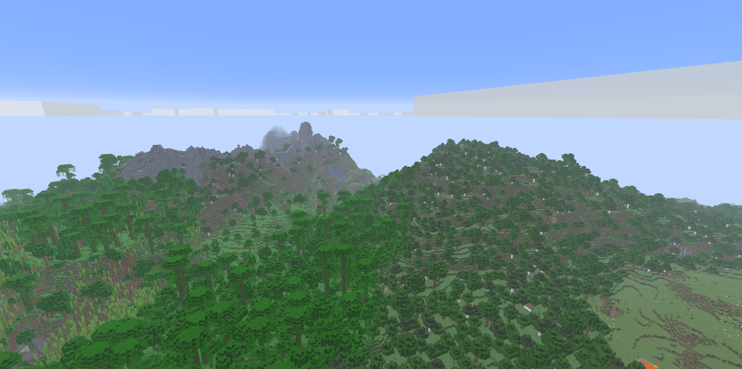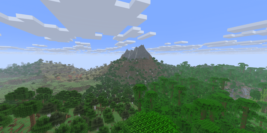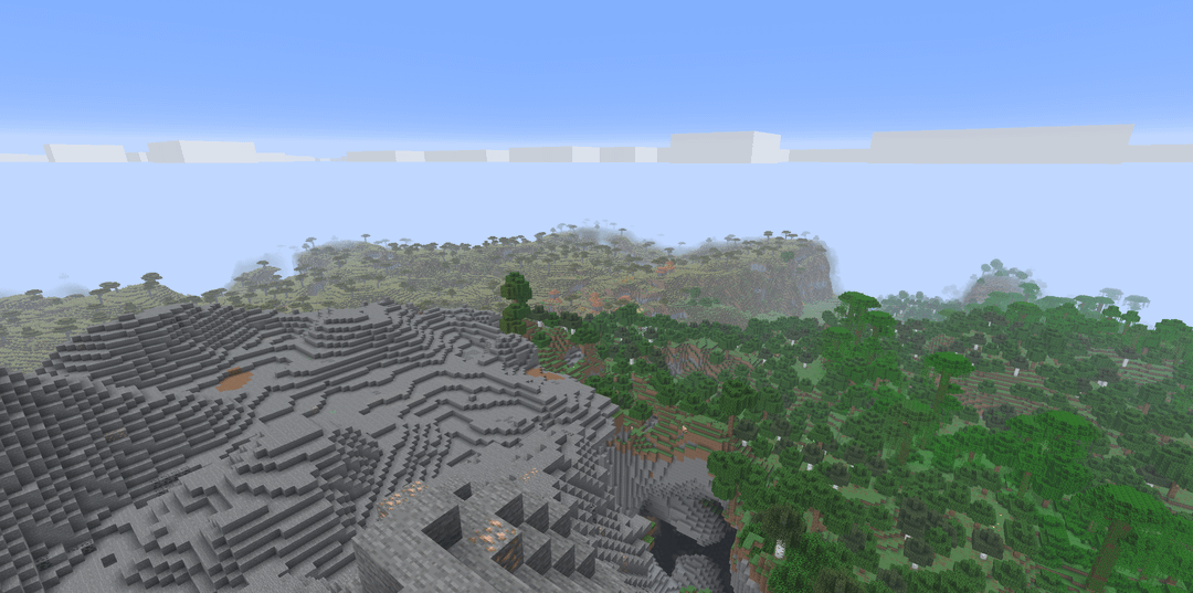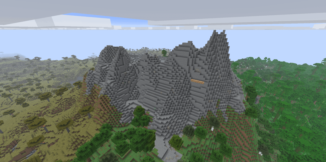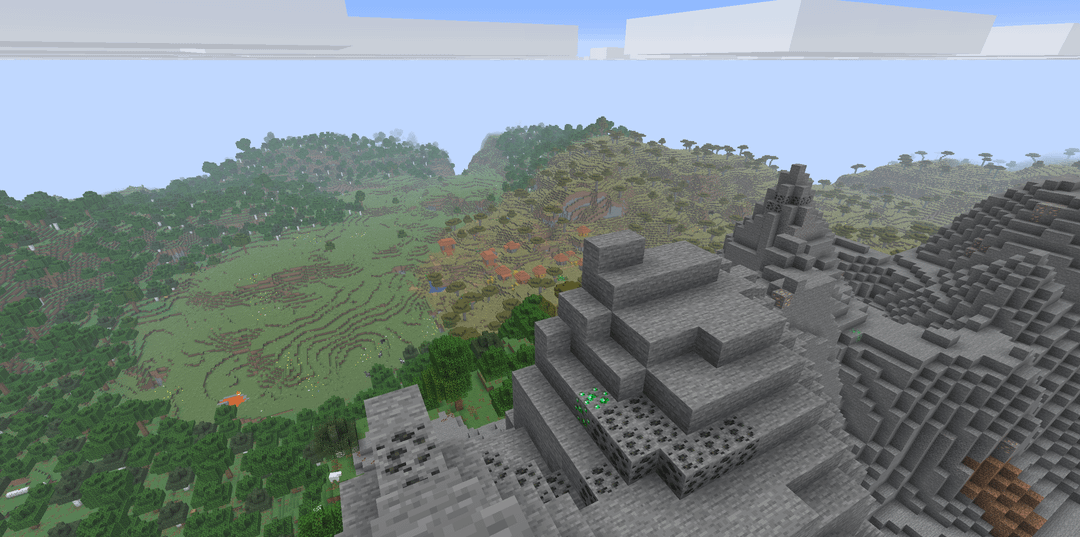 スポーン (約 0、163、8) は、森林、平原、サバンナ、ジャングルを隔てる唯一のストーニー ピークにあります。少なくとも 2 スタック相当の鉄鉱脈が、周囲 50 ブロック以内の地表に露出しています。大量の石炭と簡単に入手できるエメラルドも含まれています。
