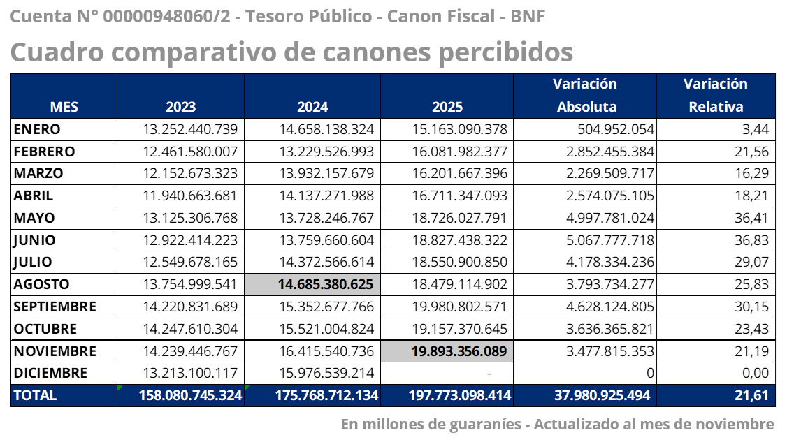 アザール・デ・パラグアイ国民委員会(コナジャル)は2025年に受け取ったロイヤルティに関する報告書を発表し、その中で、 のコレクション 今年1月から11月までのPYG 197.773.098.414、 に相当 USDの28.745.084,22.
