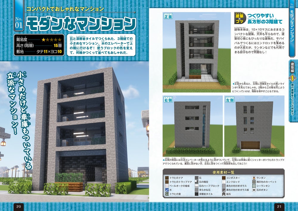 本書は、YouTubeなどで活躍する人気クラフターが手掛けた「現代的な建物&のりもの」を多数収録。それらを「家」「ビル」「のりもの」の3つに分類して、11種類の建築物を紹介しています。すべての建物が、1層ごとのマス目状の用紙に必要な素材とその置き方をアイコンで表した設計図付きです。設計図ではブロックを置く向きまでわかるほか、難しいポイントは実際のゲーム画面を添えてフォローしています。本章のやり方を真似るだけで、大きな建築物も迷うことなく組み立てられます。