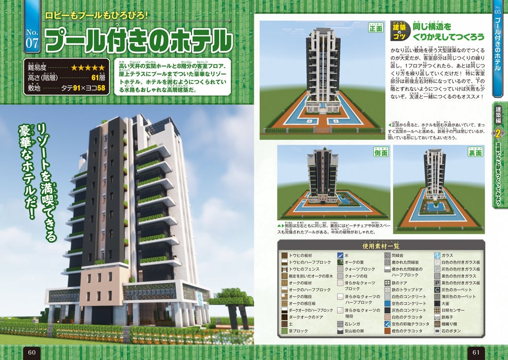 誌面では、地面の真上となる第1層、もしくは土台となる地下の第0層から順を追って最上層までの設計図を掲載。それぞれの設計図は、ひとつ前の層で置いた素材も網目で表現されており、確認しながら建築をすすめやすくなっています。