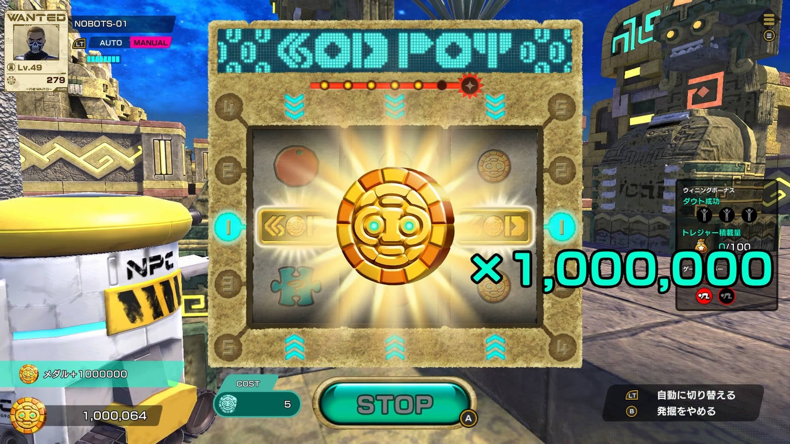 プレイヤーは、発掘ロボットになりすます最大16人のプレイヤーの中で、お宝を奪い合うことになる。遺跡では、トレジャーストーンと呼ばれるスロットマシンのようなギミックを使ってお宝を発掘。見つけたお宝を持って出口から出れば脱出となり、成果に応じてランクなどが上昇する。また遺跡で手に入れた「パワーフルーツ」と「メダル」を使うことで、さまざまなスキルを習得可能。より強力なNOBOTSとして自身を育て上げていくのだ。