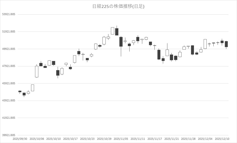 12月11日の東京株式市場は続落。日経平均株価は、前営業日比453円98銭安の5万0148円82銭でこの日の取引を終えた。米国連邦公開市場委員会(FOMC)が無事通過したことで買い優勢で始まったものの、目先材料で尽くしから利益確定の売りが出てマイナスに転じた。ソフトバンクグループが大きく下落したことも指数を押し下げた。他方、市場の主役が交代し、出遅れ物色の動きが見られるとの指摘もあった。