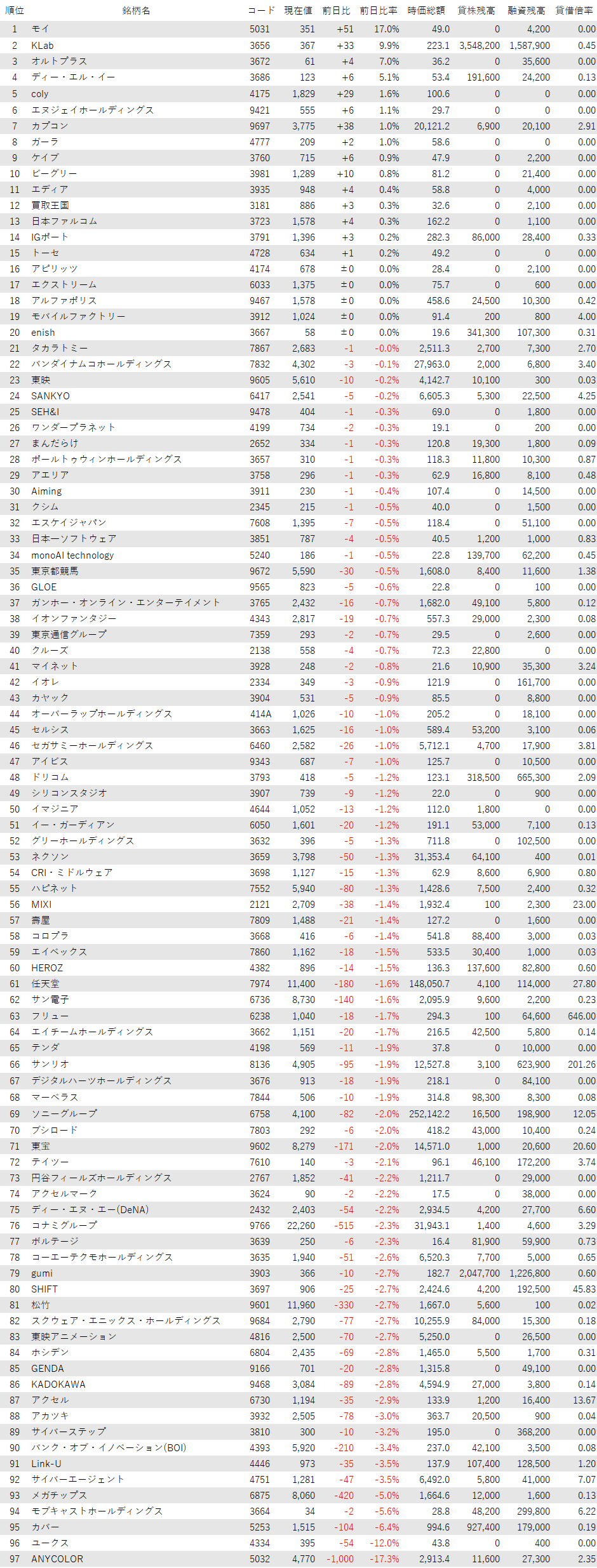騰落ランキングを見ると、上方修正を好感してモイ<5031>が急騰したほか、UAE系ファンドの資金流入でKLab<3656>も大幅続伸し連日の年初来高値後進となった。