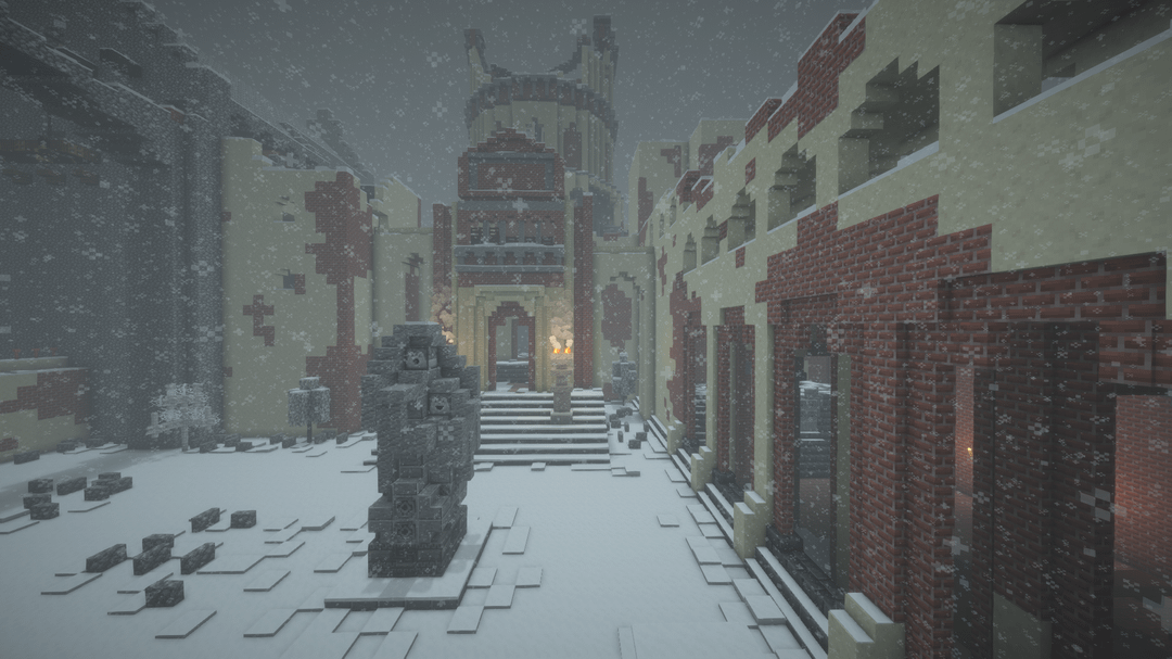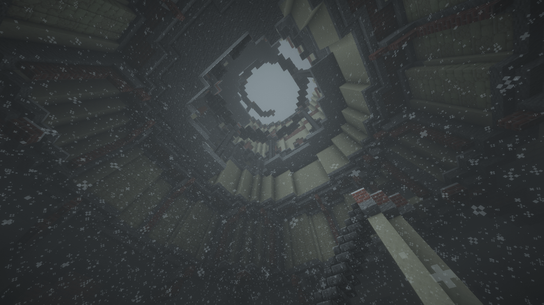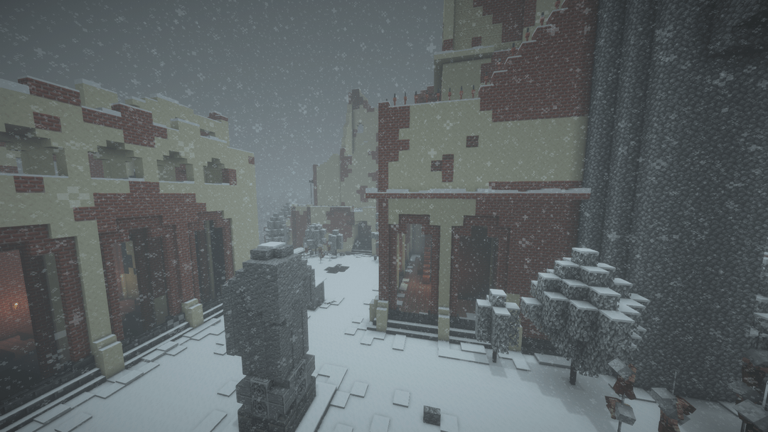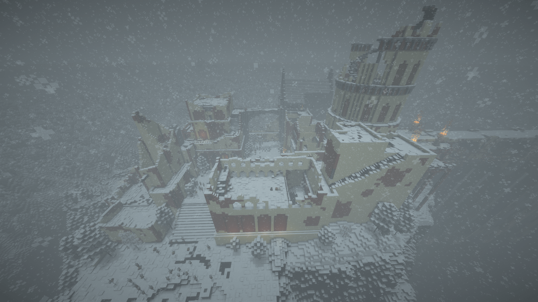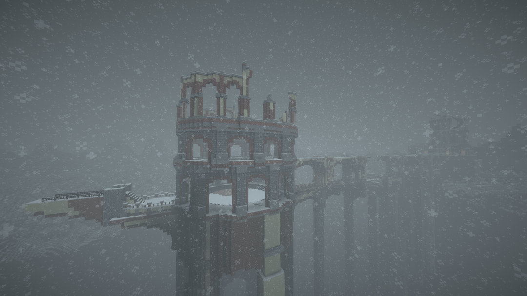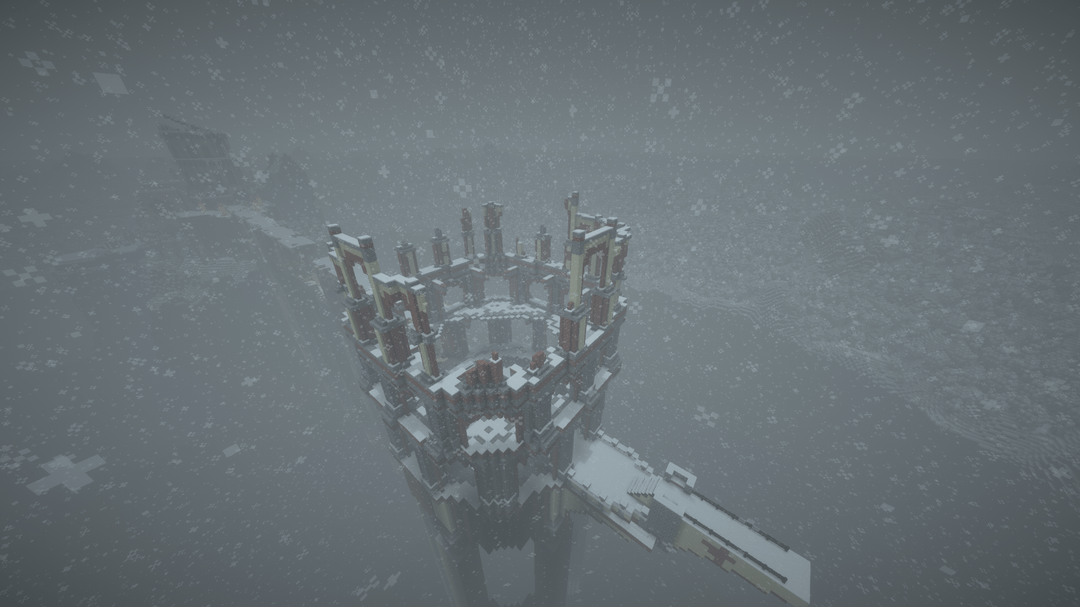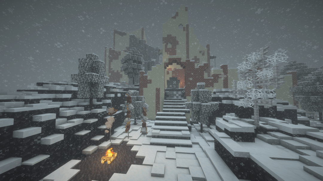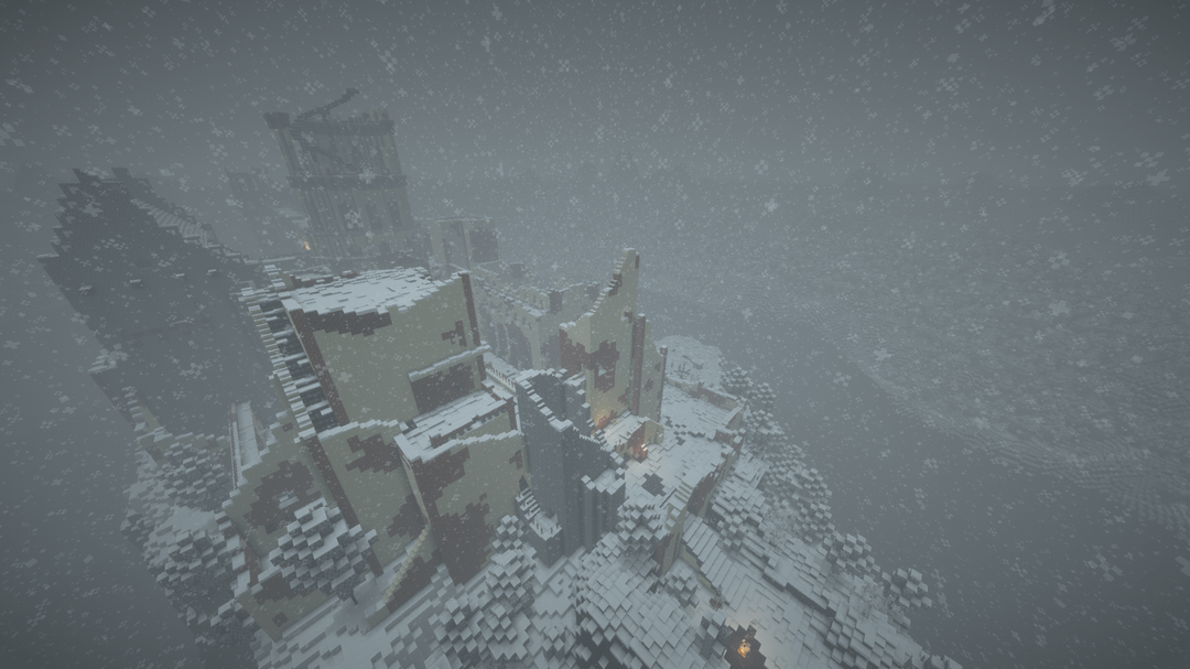 雪の降る天候の中で、遠くの地平線、BSL シェーダーを使用してビデオを録画し、ブロック エンティティ/アーマー スタンドのラグを軽減するためにエンティティ カリング MOD を使用しました。