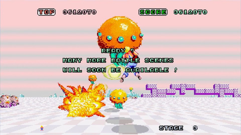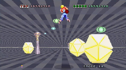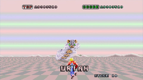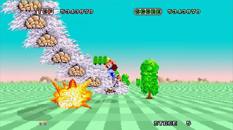 またステージ5のボーナスステージでは、ハリアーが味方のドラゴン、ユーライアの背中に乗り、木などの地上物に体当たりして根こそぎなぎ倒せるのも、ノリノリのBGMも相まって最高に気持ち良かった。