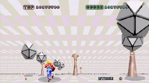 ステージ3では、最終盤にクラゲのような敵、ルーパーが超高速で次々と突っ込んでくる迫力と、そのタイミングに合わせてBGMが盛り上がる場面に全身が震えるほど感動した。ステージ4、9、14では、背景に天井が出現するとともに、滑らかに回転しながら飛来する正二十面体型の敵、ビンズビーンの怖さと美しさにシビれまくり。ステージ6では、背景にハリアーの動きに合わせて動く、スペースコロニーのようなものが出現したときもビックリした。