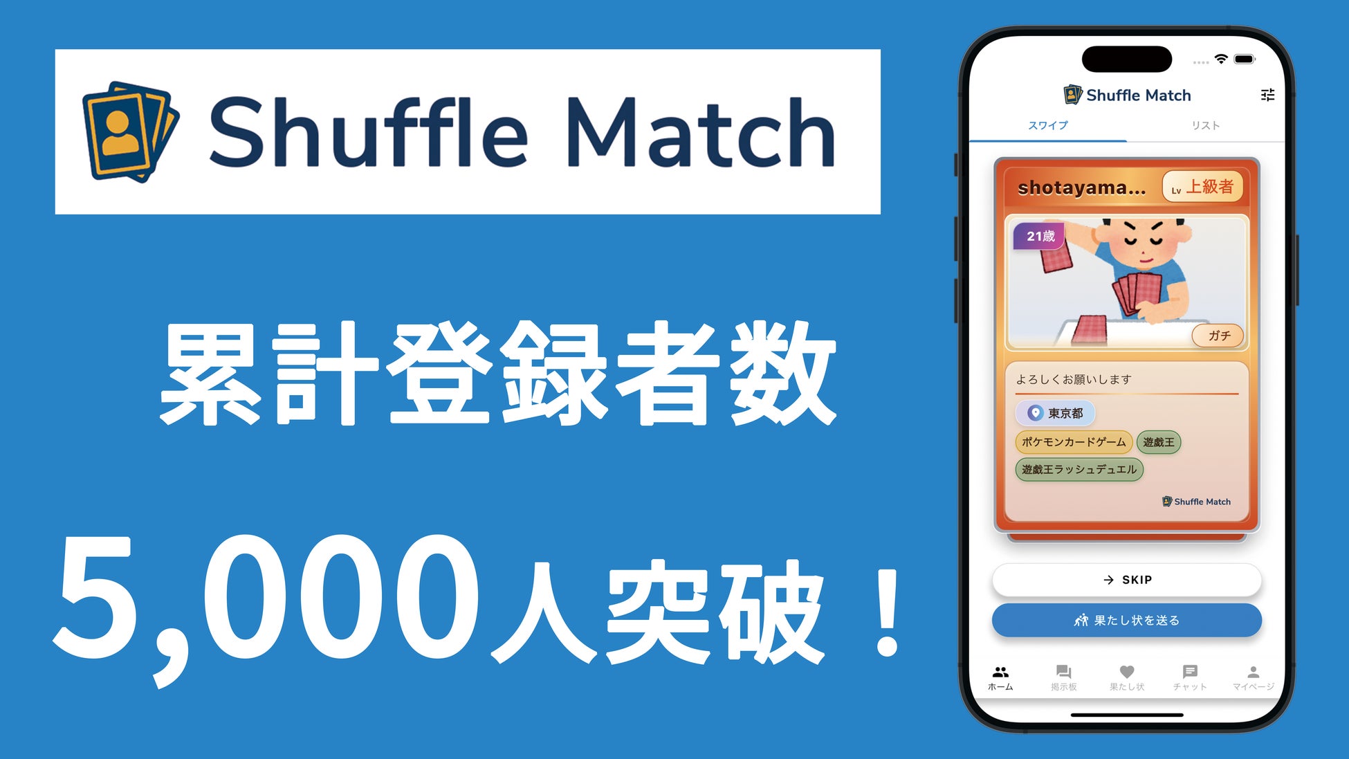 合同会社HURM TECH(本社:東京都渋谷区道玄坂1丁目16番6号二葉ビル8B、代表社員:鈴木海翔)は、カードゲーム向けマッチングアプリ「Shuffle Match」の累計登録者数が5,000人を突破したことをお知らせします。