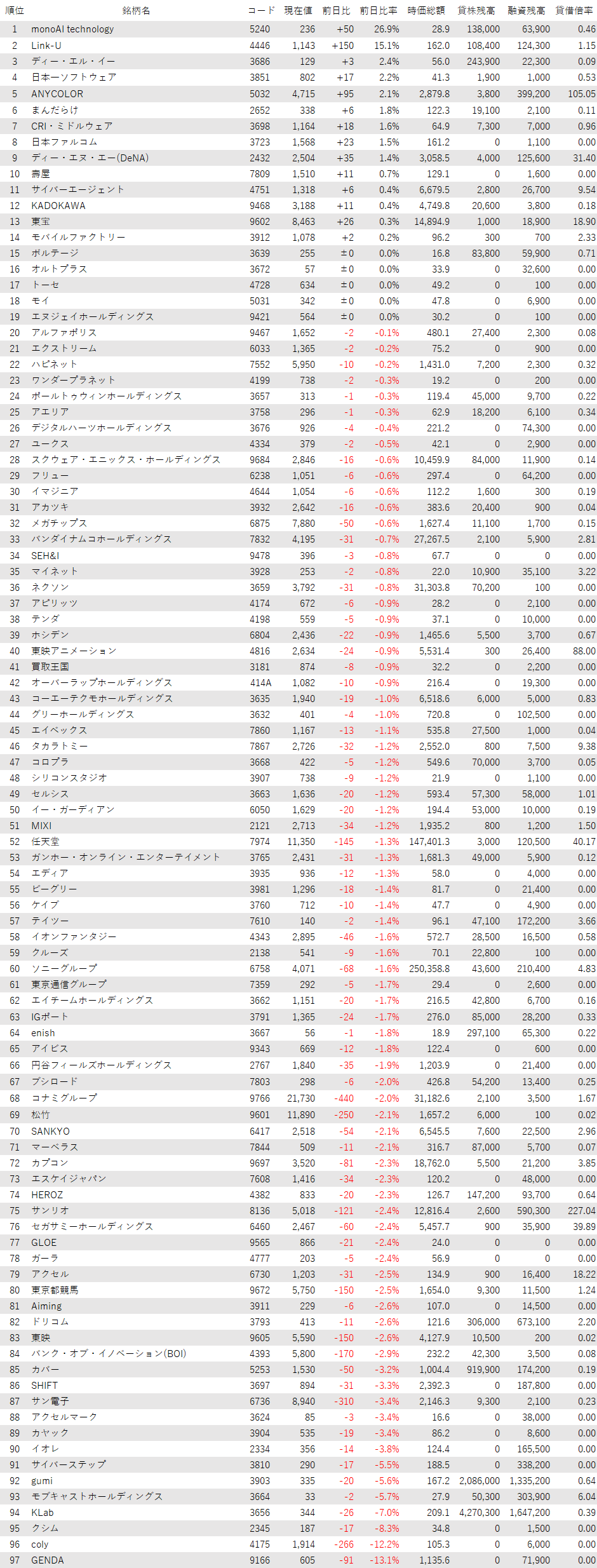 他方で、営業減益となった第1四半期決算が嫌気されたGENDA<9166>が大幅安となり、前日ストップ高まで買われたcoly<4175>が利益確定の売りに押された。クシム<2345>、KLab<3656>も値下がり率上位となった。