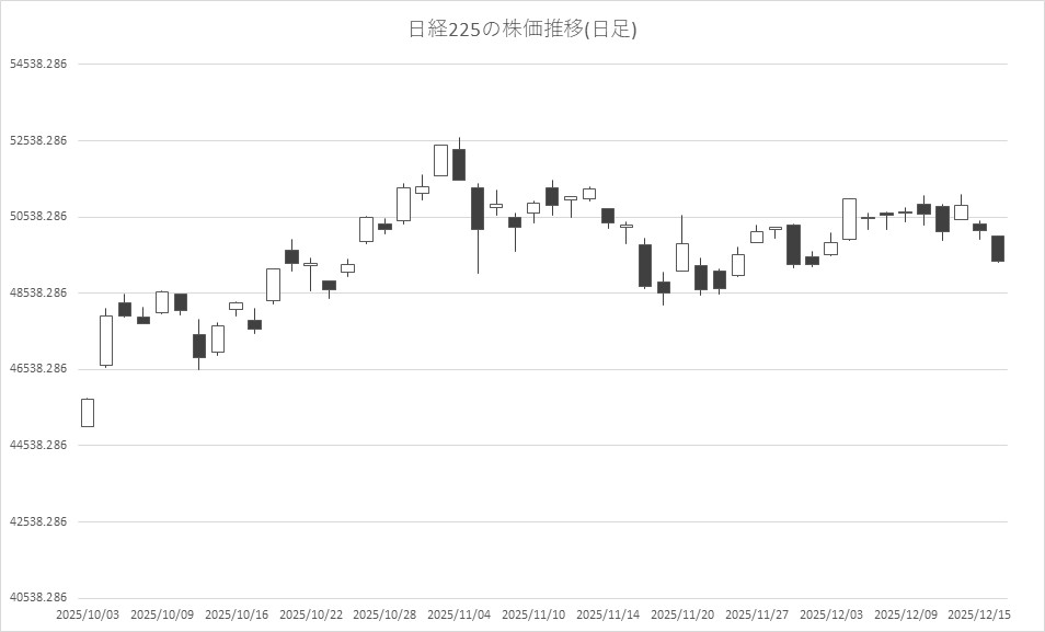 12月16日の東京株式市場は続落。日経平均株価は、前営業日比784円82銭安の4万9383円29銭と5万円割れでこの日の取引を終えた。米国の11月雇用統計と10月小売売上高の発表を控えており、AI関連とされる銘柄が売られ、一時812円24銭安まで売られる場面があった。出遅れとして堅調だったセクターも売り優勢となった。