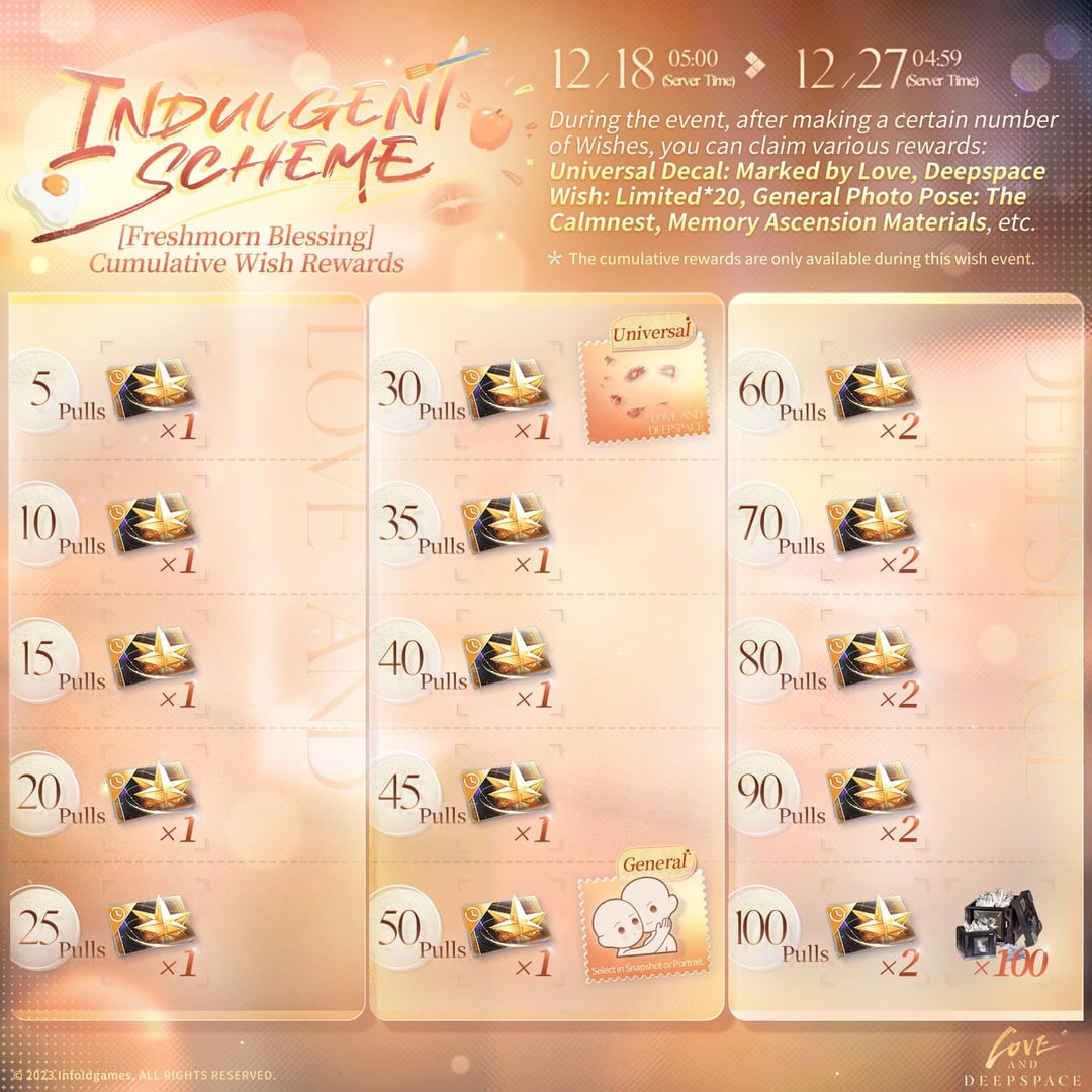 💫Freshmorn Blessing: ウィッシュ報酬 イベント期間中、一定数のウィッシュを達成すると、ユニバーサルデカールを含むさまざまな報酬を受け取ることができます [Marked by Love]、 [Deepspace Wish: Limited*20]、一般的な写真のポーズ [The Calmnest]、記憶再臨素材など ※累積願い報酬は、本願いイベント期間中のみ入手可能です。ただし、報酬のフォトポーズとデカールはイベント終了後にルナーショップで入手可能となります。