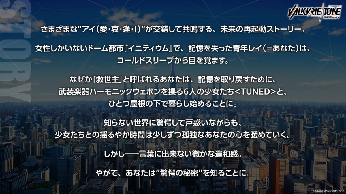 本作『ヴァルキリーチューン:機械仕掛けのアイ』は、なぜか救世主と呼ばれる記憶喪失の青年が6人の少女と暮らし、やがて驚愕の秘密を知るSF恋愛サスペンスノベルゲームである。本作の舞台となるイニティウムは、女性しかいないドーム都市だ。主人公のレイは、ある時コールドスリープから目を覚ました、記憶喪失の青年だ。何故か救世主と呼ばれるレイは、記憶を取り戻すために武装楽器ハーモニックウェポンを操る6人の少女たちと生活。知らない世界に戸惑いながら、記憶回復チームである少女たちとの時間を過ごしていく。