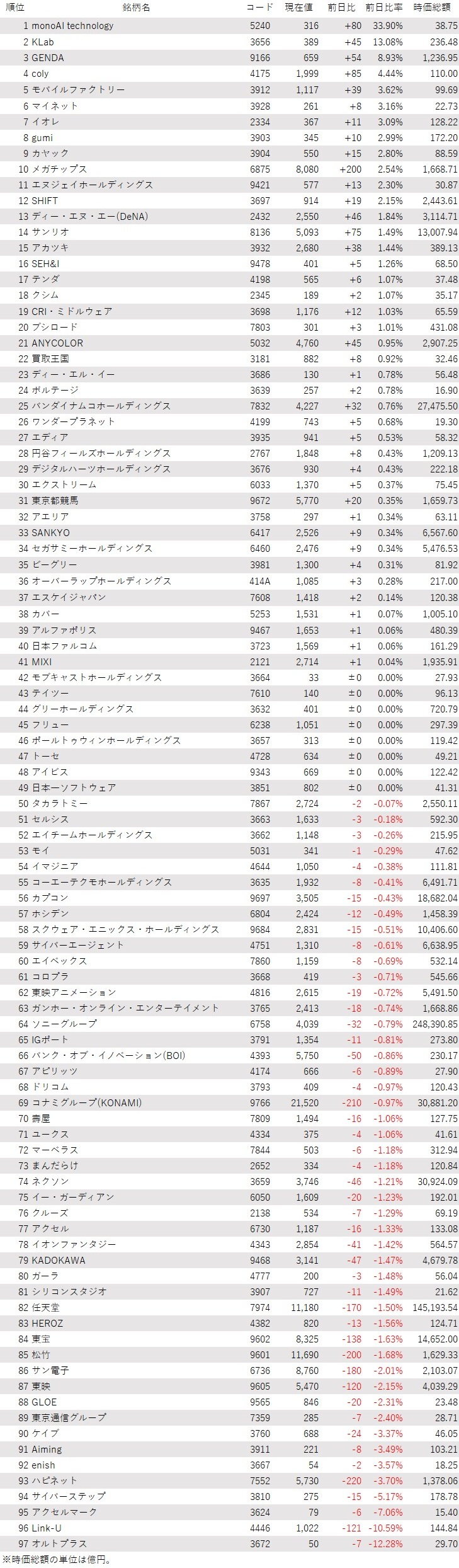 そうした中でゲーム・エンタメ関連株の動きを見てみると、下記の表に登録しているゲーム・エンタメ関連企業97銘柄のうち、上昇は41銘柄(42%)、下落は48銘柄(49%)、変わらずは8銘柄(8%)で、下落した銘柄の方がやや多かった。