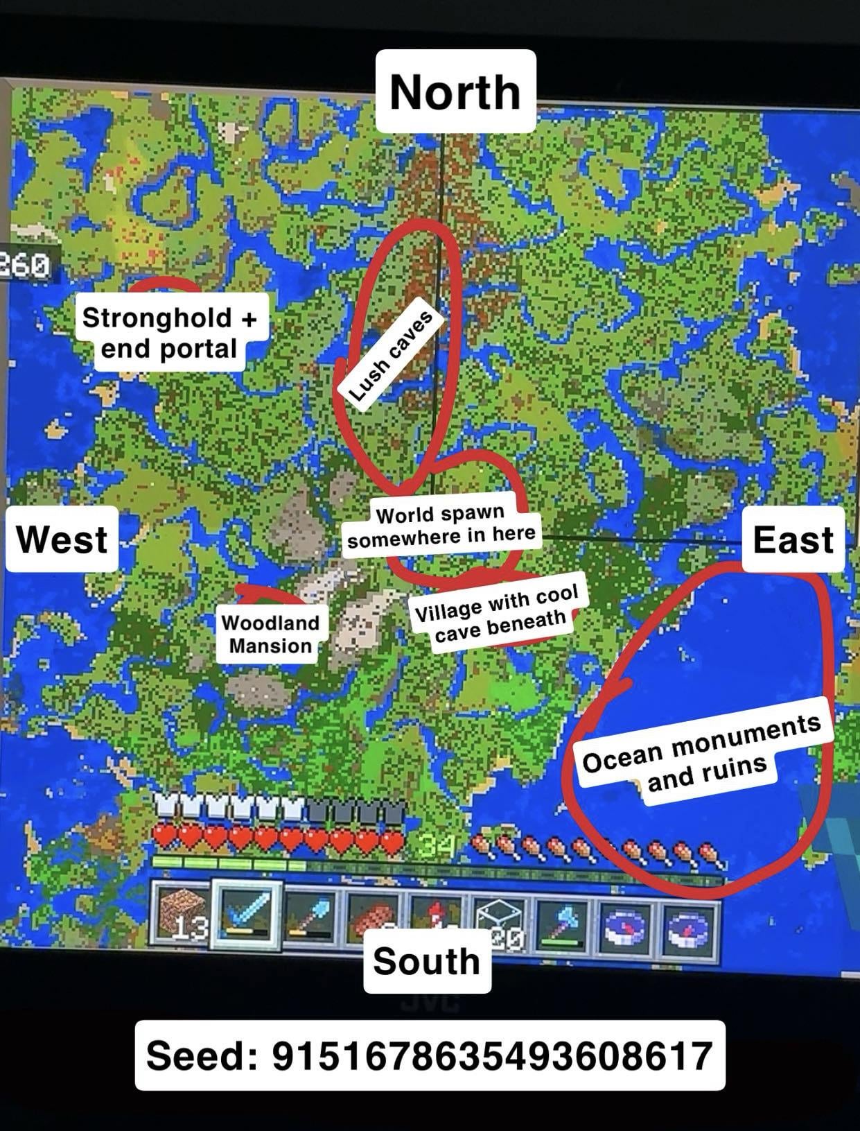 Minecraft ps5で始めた最初の世界、あなたはオークの森の渓谷にスポーンしますが、あなたの周りには非常に多くの村があり、もちろん広範囲に広がっています。タイガ バイオームの下の北には緑豊かな巨大な洞窟があり、その西には山の上に 3 層の村があり、その真下に要塞とエンド ポータルがあります。その少し南西に森の邸宅があり、チェリーとダークオークのバイオームを越えた東には、いくつかの遺跡と海洋記念碑がある広大な水域があります。楽しむ!