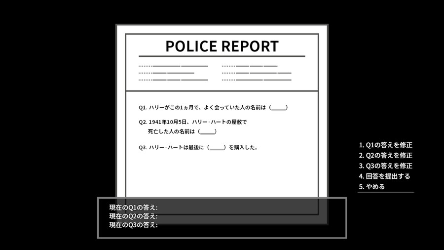 各チャプターは現場調査、聞き込み、証拠収集を経て進行し、最終的に短答式の記述問題に答えることで事件を解決に導く。これは、選択肢を機械的に選ぶのではなく、状況や証拠を読み取り、事件の背景を理解した上で論理的に考えることを要求する。おしゃれなジャズを聴きながら、本物の探偵のように事件解決に挑むのだ。