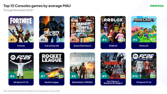 2025年の家庭用ゲーム機平均月間アクティブユーザー数トップ10は以下。