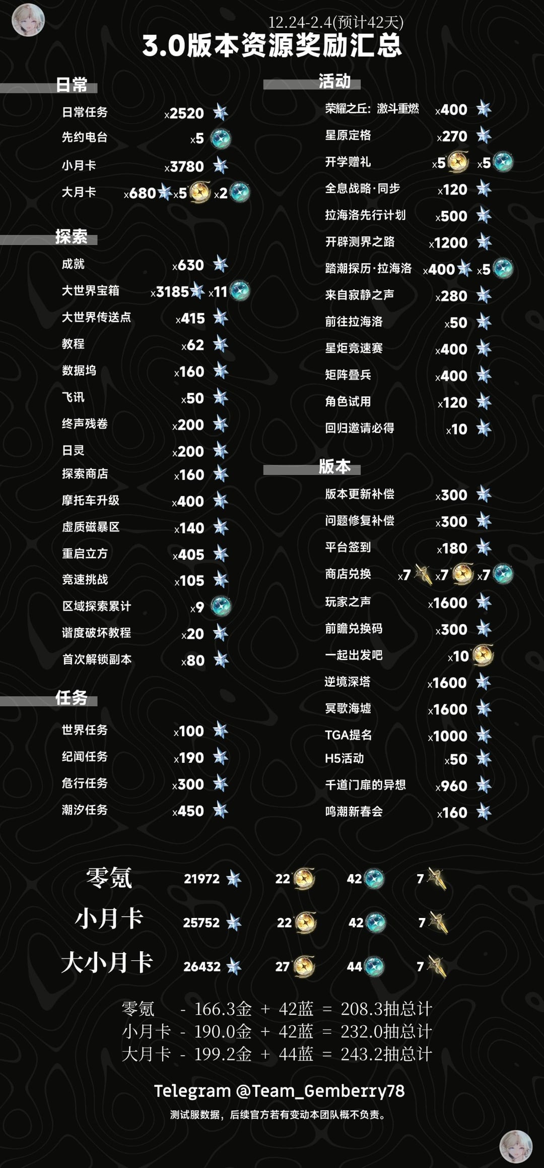 WW 3.0 ベータ版 バージョン 3.0 のリソースの概要 注: からのすべての報酬 TGA賞 に含まれています バージョン3.0 合計。 イベント 「栄光の丘:激戦再燃」 次のように計算されます アスライト400個。イベントが代わりに与える場合 アスライト 1200、 追加 追加の 800 アスライト 後は別途。 by TitanA1892003