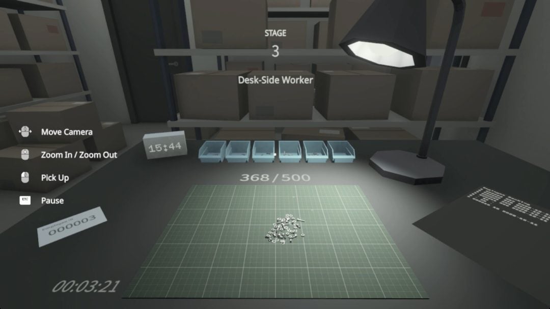 『LOW VALUE JOB』はディストピア系職業シミュレーションゲームだ。本作ではさまざまな長さのボルト、ナット、ワッシャーが散らばるデスクの上で、それぞれを種類ごとに仕分ける仕事をおこなう。本作のストアページでは、こうした作業が「虚無過ぎるパーツ分類アクション」として謳われている。分類した先でパーツを用いた組み立てシミュレーションなどといったアクティビティは特に存在せず、ただひたすらに観察と分類を繰り返していくのだろう。