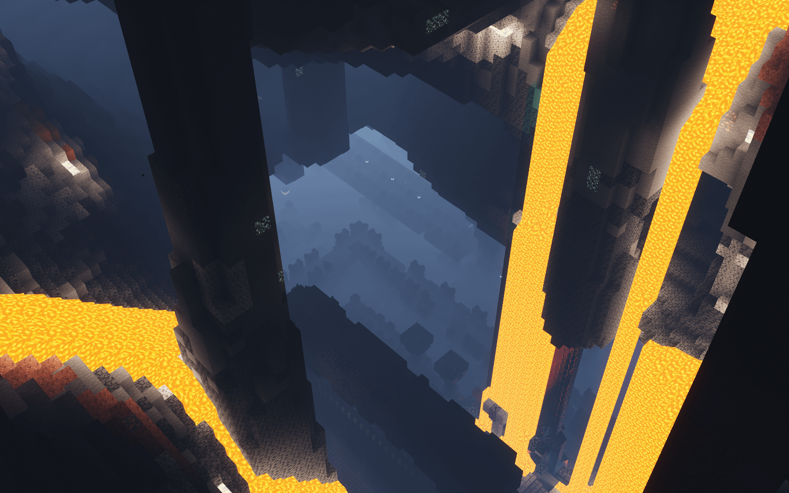 さまざまな洞窟への複数の道があり、古代都市の入り口につながる渓谷。 古代都市と一緒に シード: -8799495884371088108 座標は次のとおりです。 968 -51 1768 1.21.6-1.21.8 by Other-Vanilla-3123