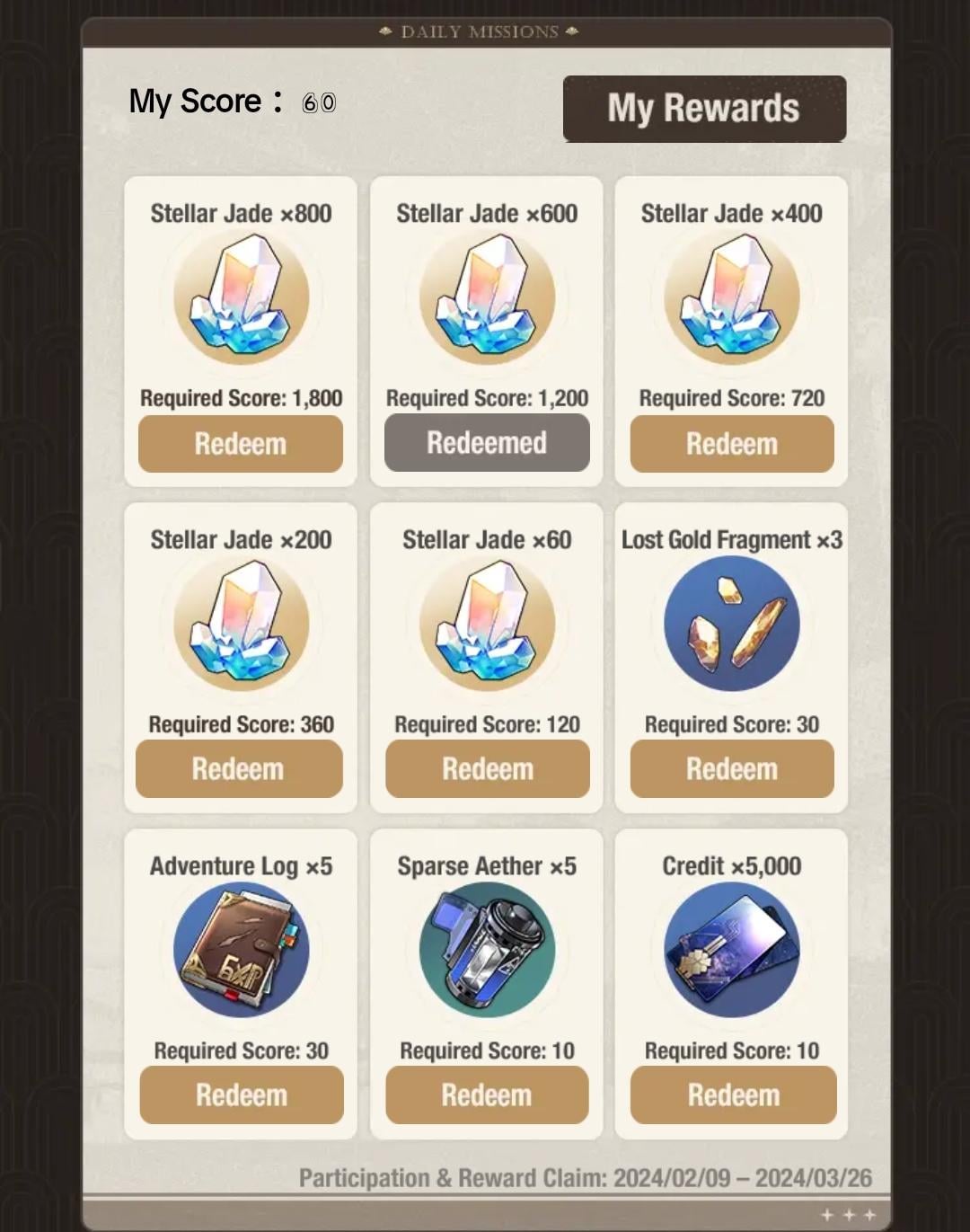 tiktokインセンティブプログラムから600ステラジェイドを入手しました。 ポイントを獲得するには少し時間がかかるかもしれませんが、#penacony のハッシュタグを付けて動画 (まったく関係のないものでも構いません) を投稿する必要があるのは毎日のことです。 まだ 20 ~ 25 日ほど時間がありますので、800 ステラ ジェイド引き換えコードを入手するために貯めておくことができます。 ご質問がございましたらお気軽にどうぞ。頑張ってください。 by Isekaidguy