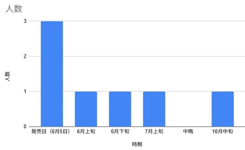 結果としてこのような形になった。編集部の当選したデータ上では発売日の当選人数が3名と最も多く、いずれもマイニンテンドーストアで当選したようだ(内1名は多言語対応版が当選)。続いて発売月である6月中に2名が購入し、翌月の7月にまた1名がゲット。発売に先駆けて抽選が実施されていた事もあってか、発売月に3名と発売月に2名の計5名、発売から約1カ月で計6名の当選が決まっている。最も当選が遅いスタッフも10月のマイニンテンドーストアの販売にて購入できている。