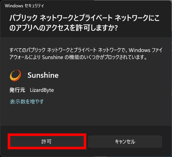 アプリへのアクセスの許可を求めるウィンドウが表示される場合は「許可」をクリック。