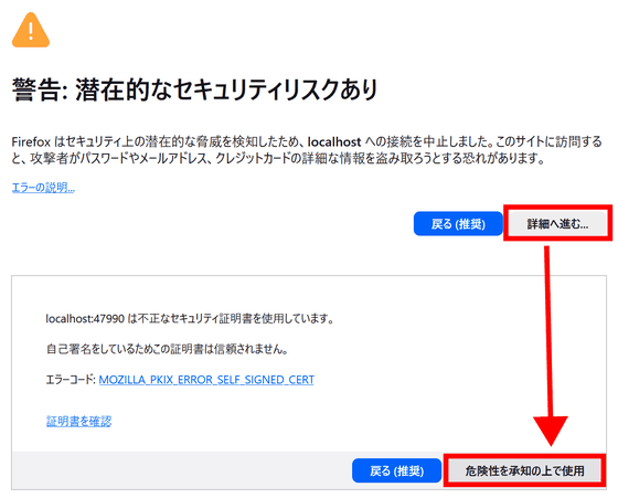 ブラウザが自動的に起動し管理画面へのアクセスが行われますが、セキュリティの警告が出た場合は「詳細へ進む」をクリックし、さらに「危険性を承知の上で使用」をクリックして進めます。