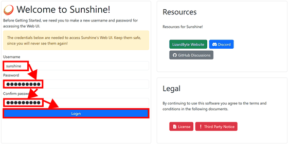 初期ページが表示されるので「Username」に使用したいユーザー名、「Password」と「Confirm password」に使用したいパスワードを入力後、「Login」をクリックしてユーザーを作成します。