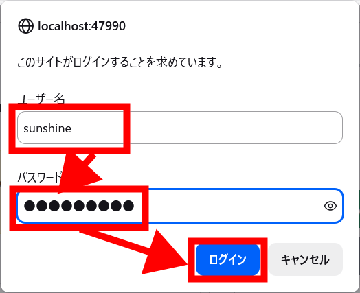 ユーザー作成後もう1度「Login」をクリックすると、今度はBASIC認証のウィンドウが表示されるので、先ほど作成したユーザー名とパスワードを入力して「ログイン」をクリック。