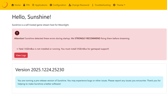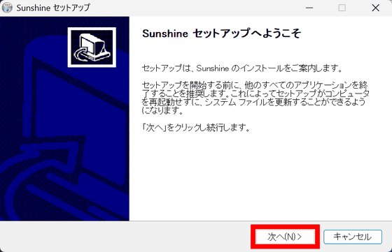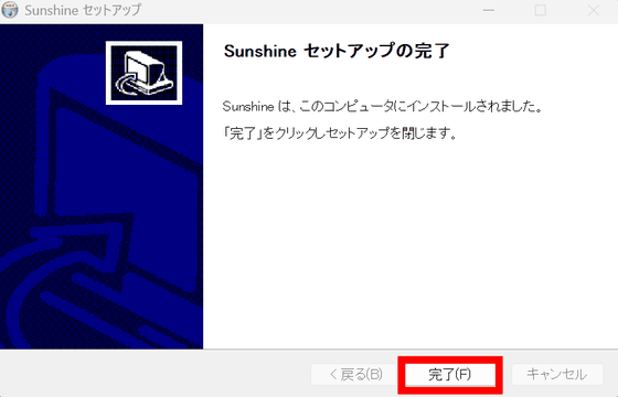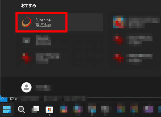 「スタートボタン」をクリックし「Sunshine」のアイコンをクリックして起動します。