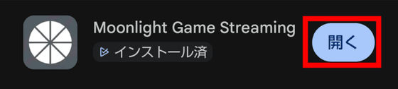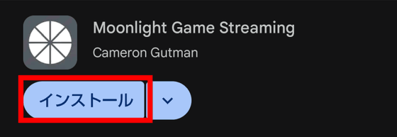 各デバイスごとに使えるクライアントが用意されており、公式サイトの「CLIENT DOWNLOAD」からWindows・MacOS・Linux・Raspberry Pi 4・Android・iOS・Xbox・PS Vita・Nintendo Switch・Wii U・LG webOS TV用がダウンロード可能です。今回はTailscaleがインストールされているAndroid端末を使います。Google Playストアから「Moonlight Game Streaming」を検索し「インストール」をタップ。